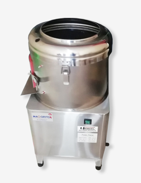 De cuerpo compacto, fabricado en acero inoxidable, paredes internas forradas en abrasivos, motor de gran competencia, simple manipulación y limpieza. El tambor o cilindro de procesamiento soporta una carga de hasta 10 kg por ciclo o batch, con un promedio de procesamiento de 3 minutos por ciclo, lo que permite lograr una producción hora de unos 200 Kg con un óptimo acabado. El compartimiento de salida de producto procesados dispone de una tapa abatible (con un pestillo para controlar su cierre y apertura), contando con las dimensiones suficientes para trabajar gran variedad de calibres de papa u otros productos (chicos, medianos, grandes). Incluye accesorio válvula para punto de entrada / conexión de agua, punto de salida para evacuación de residuos, además de patas antideslizantes para brindar la mayor estabilidad durante su operación.